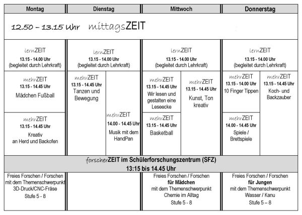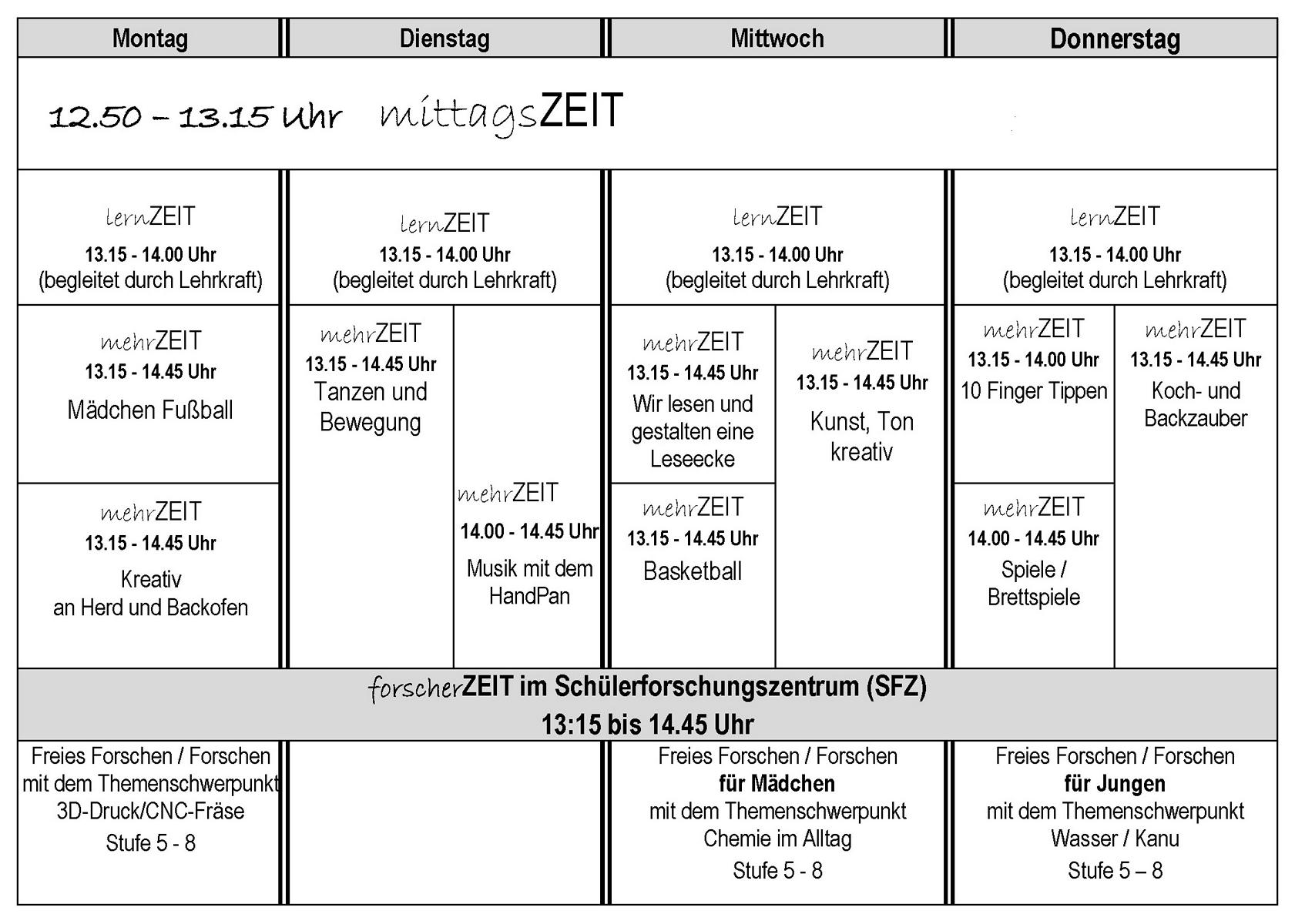 Die GanstagsZEITen sind untergliedert in mittagsZEIT, lernZEIT, mehrZEIT und forscherZEIT.